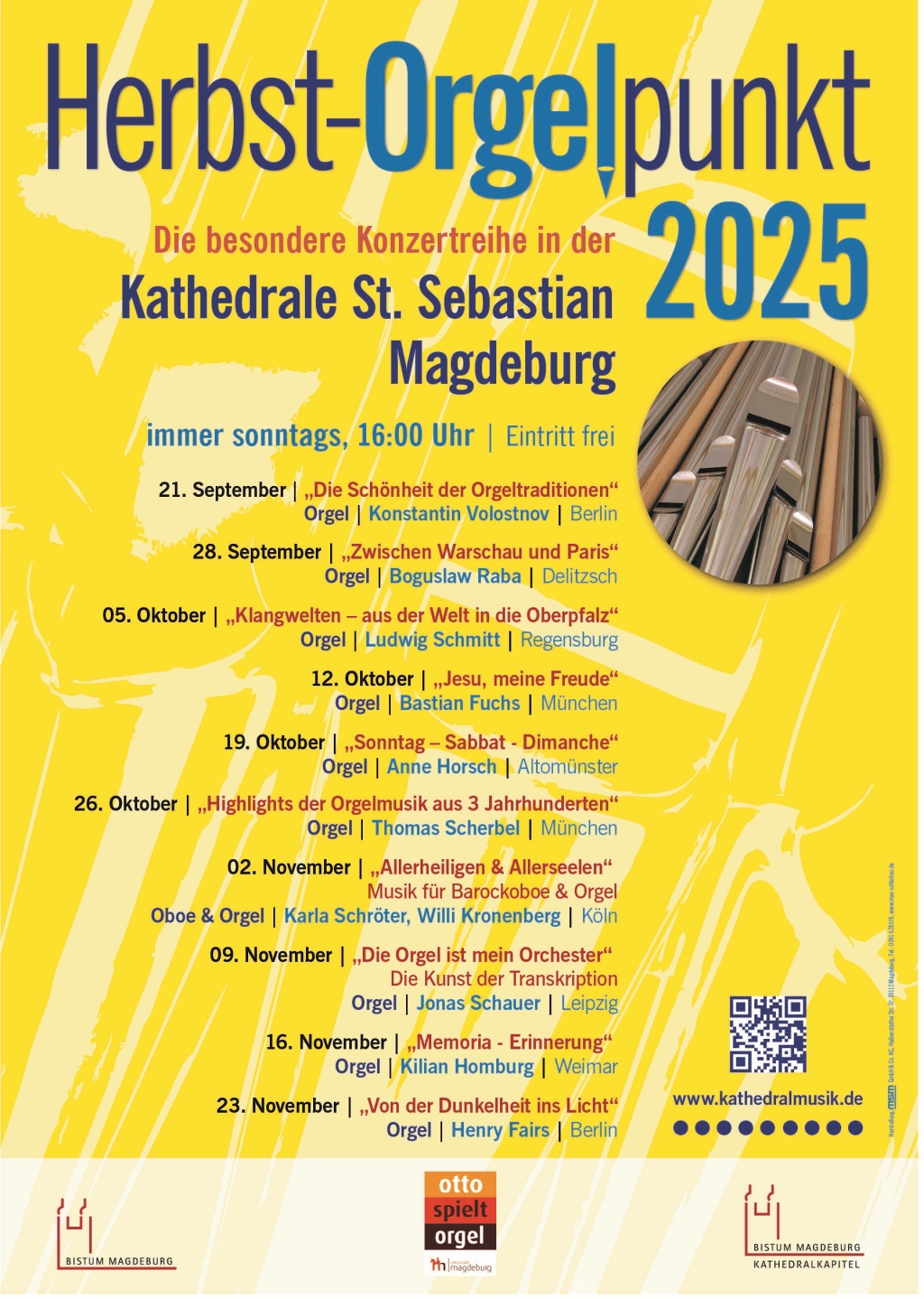 Der Herbst-Orgelpunkt steht weiterhin unter der künstlerischen Leitung von Kathedralmusiker Matthias Mück und wird vom Kathedralkapitel im Bistum Magdeburg veranstaltet. Der sakrale Raum der Kathedrale St. Sebastian ergänzt die musikalische Erfahrung und lenkt – so die Veranstalter – den Geist auf das, „was uns in der Betriebsamkeit des alltäglichen Geschehens oft fehlt“. |