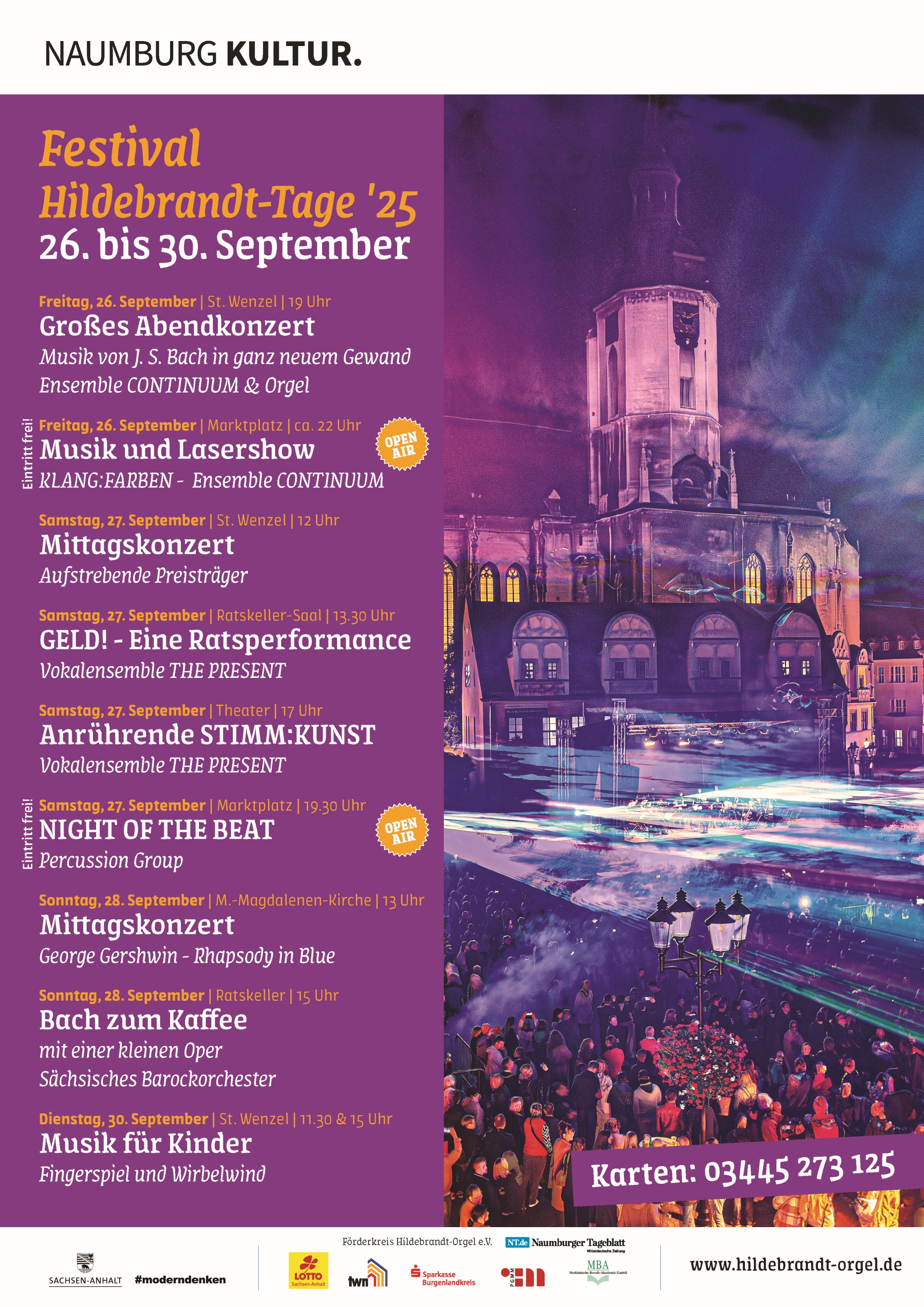Die Hildebrandt-Tage 2025 werden großzügig gefördert durch das Land Sachsen-Anhalt, Lotto Sachsen-Anhalt, die Technischen Werke Naumburg, die Sparkasse Burgenlandkreis, das Naumburger Tageblatt/Mitteldeutsche Zeitung, die Planungsgruppe M+M AG, die Medizinische Berufs-Akademie GmbH sowie den Förderkreis der Hildebrandt-Orgel e.V. |