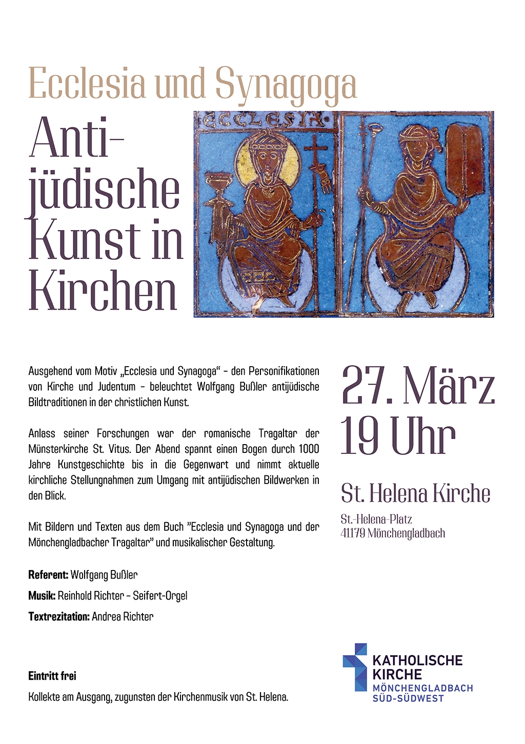Ausgehend vom Motiv „Ecclesia und Synagoga“ – den Personifikationen von Kirche und Judentum – beleuchtet Wolfgang Bußler antijüdische Bildtraditionen in der christlichen Kunst. Anlass seiner Forschungen war der romanische Tragaltar der Münsterkirche St. Vitus. Der Abend spannt einen Bogen durch 1000 Jahre Kunstgeschichte bis in die Gegenwart und nimmt aktuelle kirchliche Stellungnahmen zum Umgang mit antijüdischen Bildwerken in den Blick.