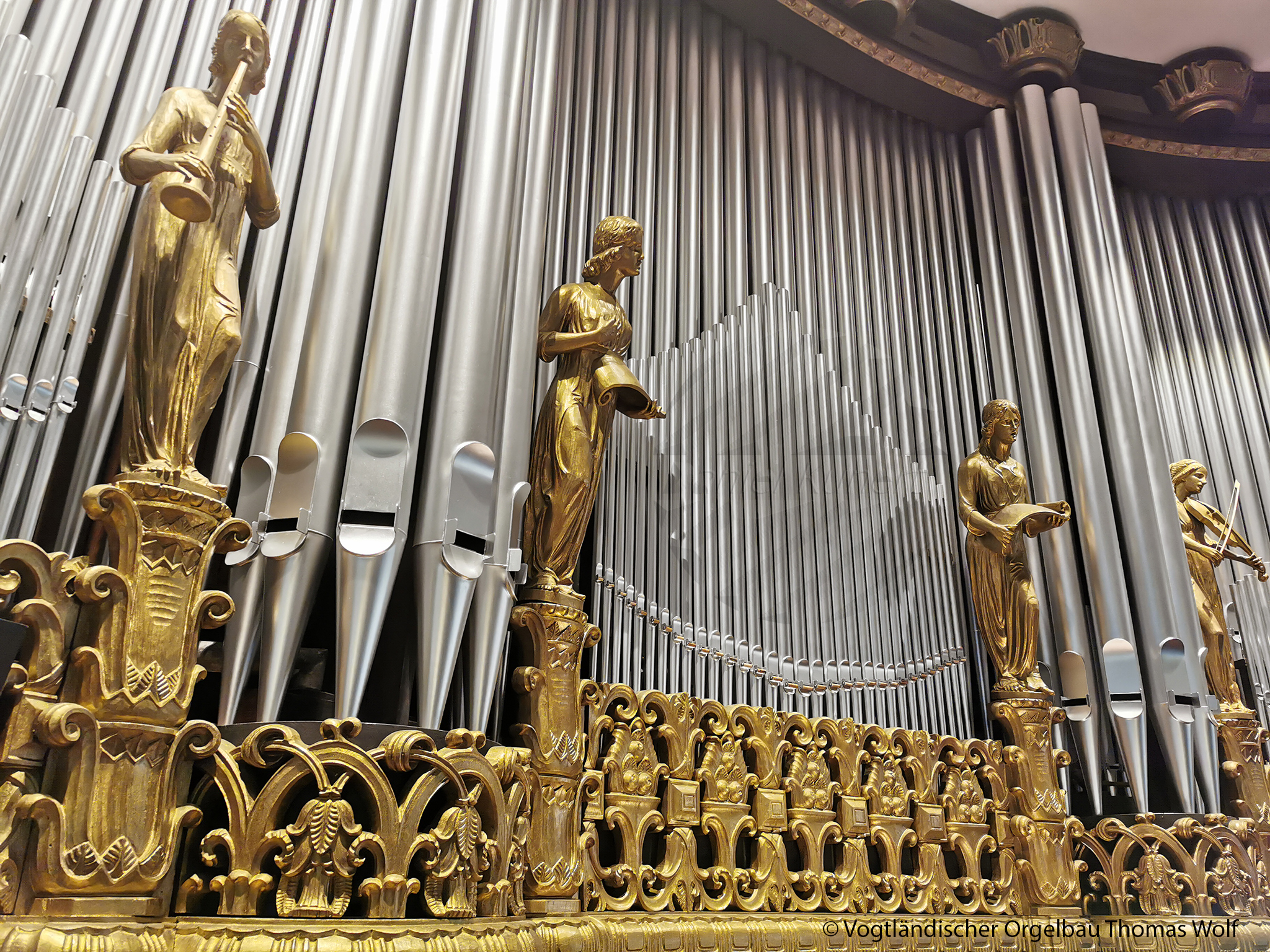 Ihr Jugendstil-Prospekt ist mit vier schlanken, musizierenden Frauengestalten verziert. Die Schnitzarbeiten stammen vom Dresdner Bildhauer Viehweg.