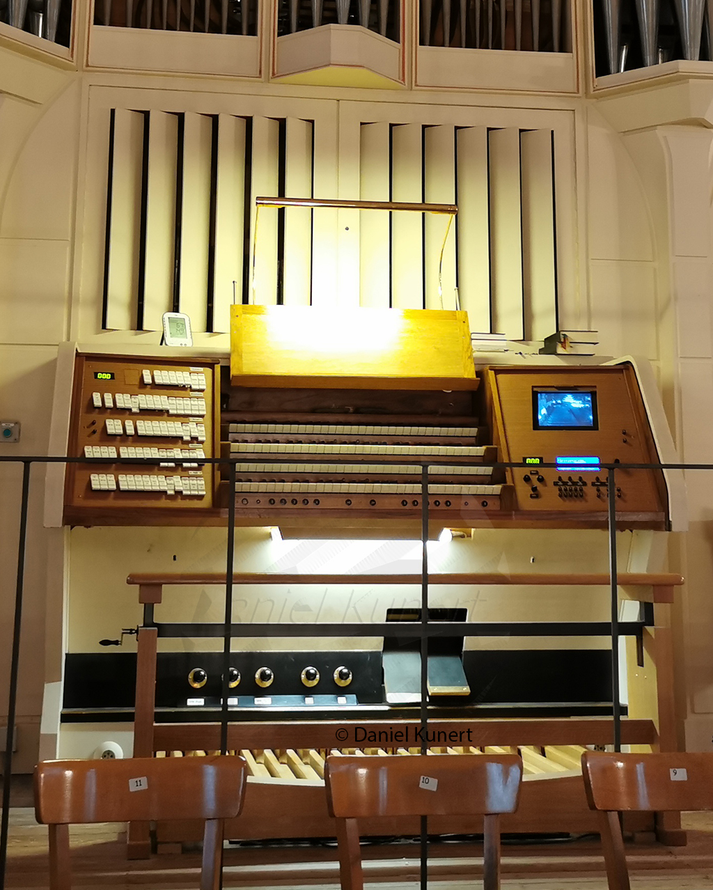 10 Koppeln, 3 Tremulanten, 2 Schweller (für Brustwerk und Schwellwerk).
