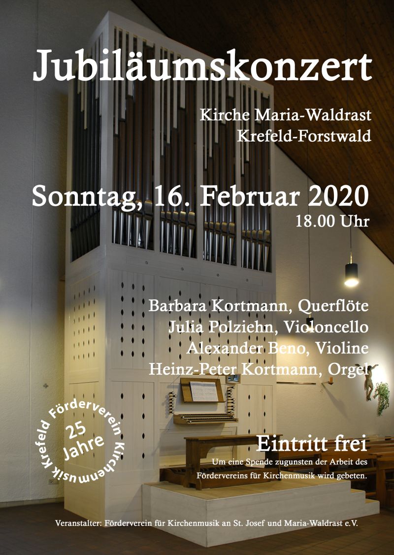 Der Förderverein lädt am Sonntag, den 16. Februar 2020 um 18.00 Uhr zu einem Jubiläumskonzert nach Maria-Waldrast ein. Mit Musik für Violine, Querflöte, Violoncello und Orgel erwartet die Zuhörer*innen ein apartes Programm mit Werken von J.S. Bach, J. Quantz, J.B. Boismortier, u.a.. Die Mitwirkenden sind Barbara Kortmann (Querflöte), Julia Polzien (Violoncello), Alexander Beno (Violine) und Heinz-Peter Kortmann (Orgel).