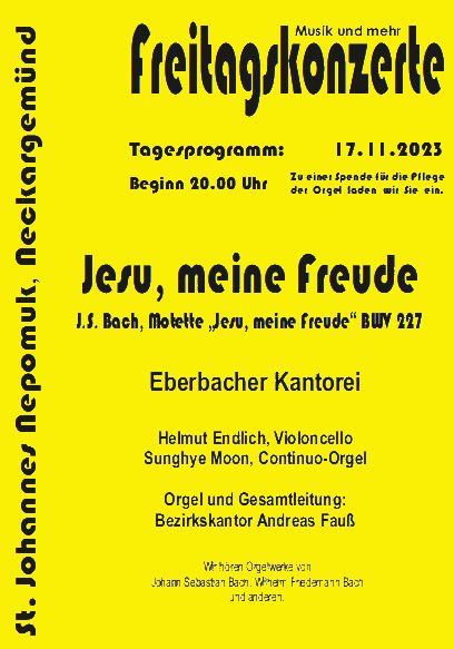 Das freitagskonzert „Jesu meine Freude“ beginnt am 17.11.2023 um 20Uhr in der katholischen Kirche Neckargemünd am Marktplatz. Hierzu ergeht eine herzliche Einladung. Die Kirche wird wie in früheren Jahren gewohnt beheizt werden. Der Eintritt ist frei, am Ausgang wird um eine Kollekte zu Gunsten der Orgel gebeten. |