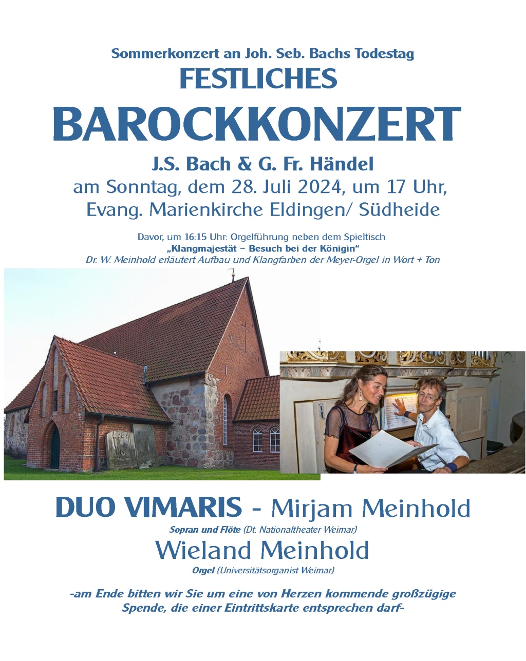 Mit berühmten Instrumental-, Vokal- und Orgelwerken der beiden großen Barockmeister J. S. Bach und G. Fr. Händel werden Mirjam & Wieland Meinhold (alias Duo Vimaris) aus dem thüringischen Weimar am Sonntag, dem 28. Juli 2024, um 17 Uhr in der Marienkirche zu Eldingen gastieren. So darf man einen hohen Wiedererkennungseffekt erwarten, den neben bekannten, berührenden Arien und Orgelwerken (u.a. aus dem beliebten "Notenbüchlein der Anna-Magdalena Bach", Largo von Händel, d i e weltbekannte d-Moll-Toccata von Bach) werden auch elegante, inspirierende und quicklebendige Sonaten von beiden Komponisten für Flöte und Orgel zu erleben sein.