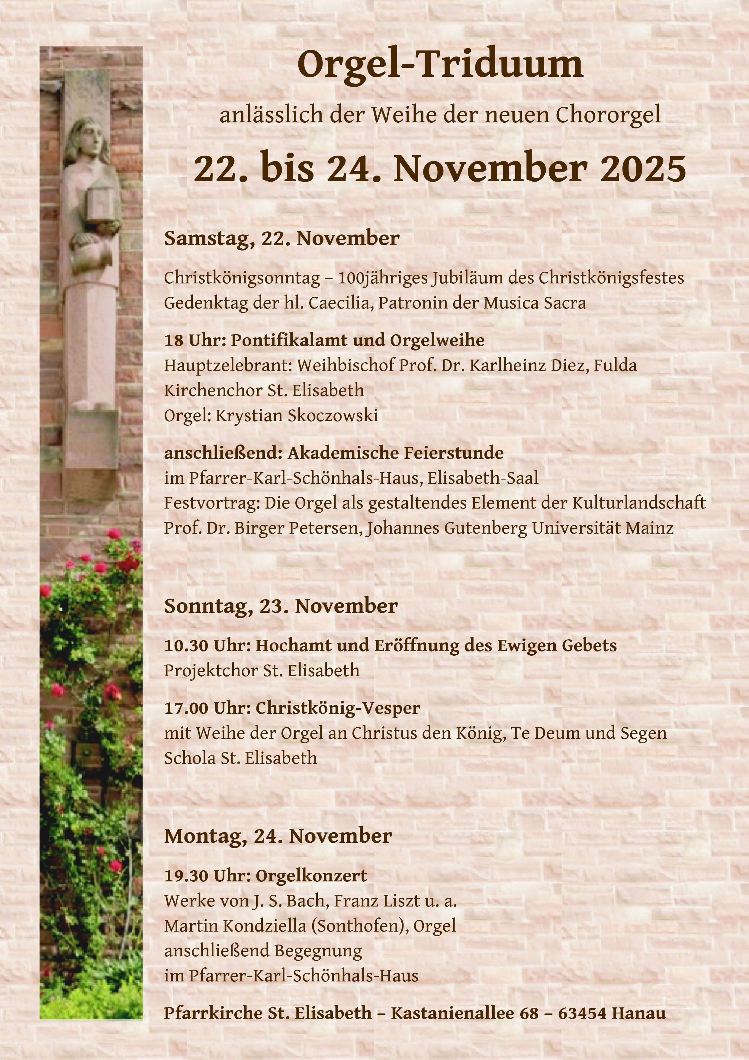 Am Samstag, dem 22. November um 18 Uhr wird in der Pfarrkirche St. Elisabeth (Kastanienallee 68, 63454 Hanau) die neu erbaute Chororgel im Rahmen eines feierlichen Gottesdienstes ihrer Bestimmung übergeben. Weihbischof Prof. Dr. Karlheinz Diez aus Fulda wird die liturgische Orgelweihe zelebrieren, der Kirchenchor St. Elisabeth und Kantor Dr. Krystian Skoczowski werden den musikalischen Rahmen gestalten. Im Anschluss an die hl. Messe wird im Elisabeth-Saal des benachbarten Pfarrer-Karl-Schönhals-Hauses eine akademische Feierstunde stattfinden. In diesem Rahmen wird Prof. Dr. Birger Petersen von der Johannes Gutenberg Universität Mainz einen Festvortrag über „die Orgel als gestaltendes Element der Kulturlandschaft“ halten.