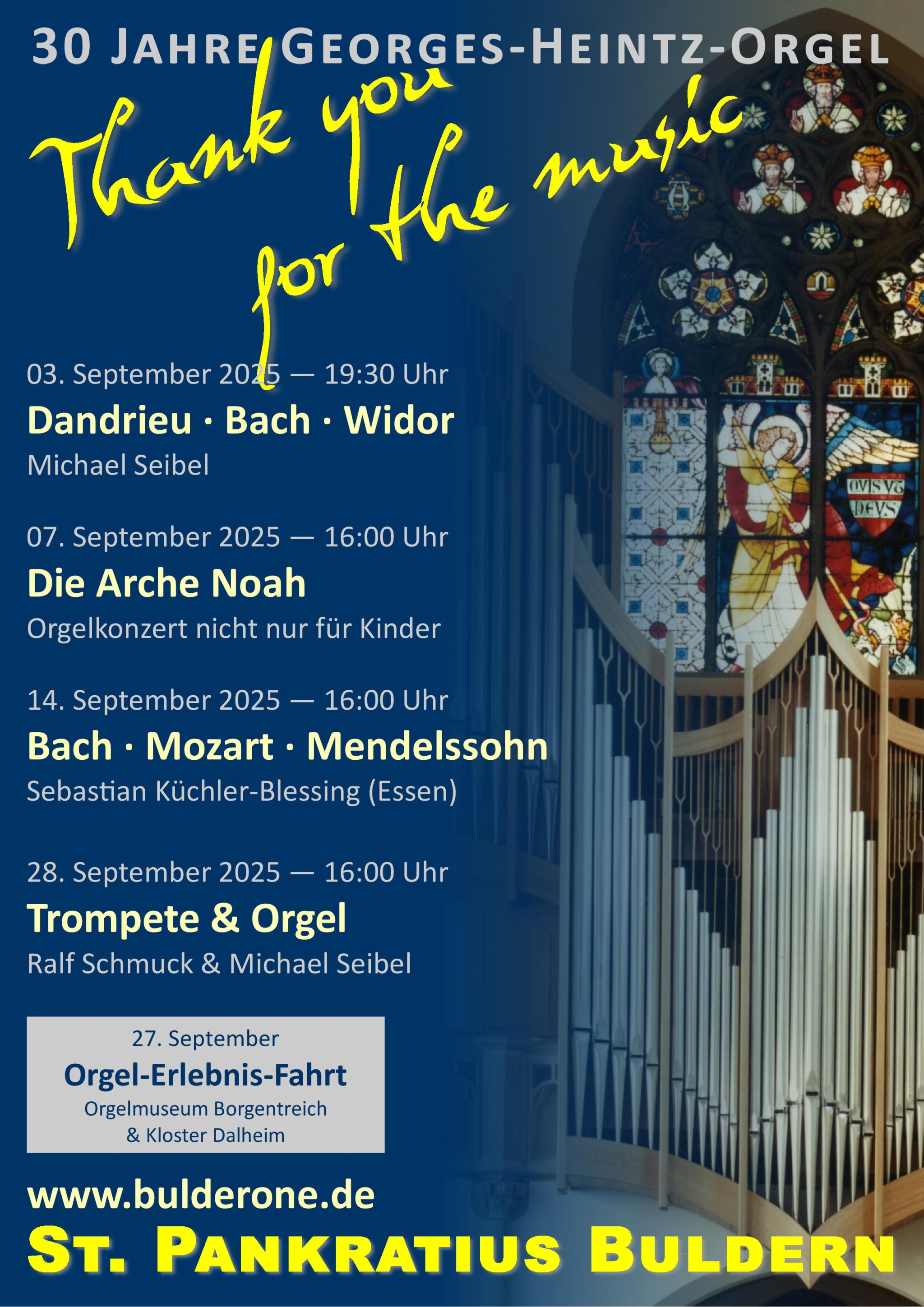 „Eine Kirche ohne Orgel ist wie ein Körper ohne Seele“, so zitiert Organist Michael Seibel den berühmten Urwalddoktor Albert Schweizer, „und St. Pankratius hat so gesehen eine besonders schöne Seele“, so ergänzt er.Vor dreißig Jahren, im September 1995, wurde die Orgel in Buldern geweiht und wie könnte das passender gefeiert werden als mit viel fröhlicher und feierlicher Musik.