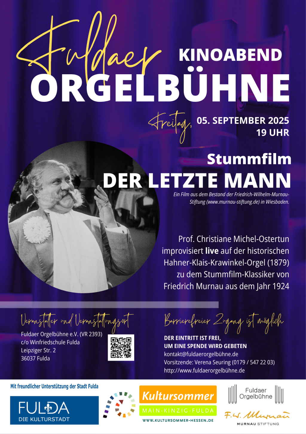 Der schuleigene Verein Fuldaer Orgelbühne e.V. lädt Sie und Euch herzlich zu dem traditionellen Orgel PLUS Stummfilm (Kinoabend) am Freitag, 05.09.2025 um 19 Uhr ein, der eine Veranstaltung des jährlichen Kultursommers Main-Kinzig-Fulda darstellt und mit rund 150 Veranstaltungen die kulturelle Vielfalt unserer Region verdeutlicht.