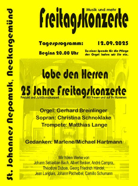 Freitagskonzerte an St. Johannes Nepomuk Neckargemünd gibt es seit dem Jahr 2000, somit können wir dieses Jahr 25 Jahre freitagskonzerte feiern. Das nächste freitagskonzert am 12.9.2025 wird daher ein Jubiläumskonzert und somit ein ganz besonderer Event werden, bei dem sogar ein neues Orgelregister eingeweiht werden wird.