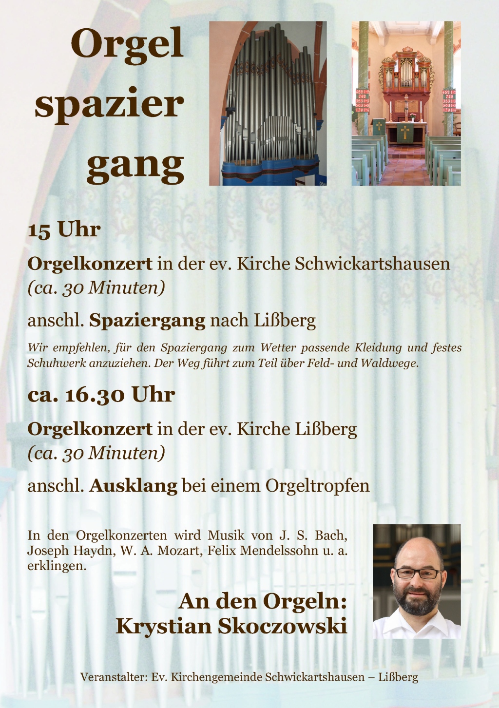 In den beiden kurzen Orgelkonzerten wird Krystian Skoczowski Musik von J. S. Bach, Joseph Haydn, W. A. Mozart, Felix Mendelssohn u. a. zum Klingen bringen. Dabei werden die besonderen Qualitäten der sehr unterschiedlichen Instrumententypen der beiden Kirche vorgestellt: die romantische Orgel von Schwickartshausen aus dem Jahr 1913 mit ihrem vollen, warmen Klang und die im vergangenen Jahr renovierte, an barocken Vorbildern orientierte Orgel in Lißberg von 1971/1993 mit historischem Prospekt von 1702.