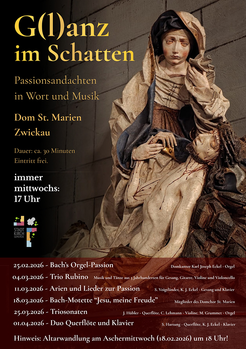 Unter dem Titel „G(l)anz im Schatten“ lädt der Dom St. Marien Zwickau vom 25. Februar bis 1. April 2026 zu einer besonderen Reihe von Passionsandachten ein.