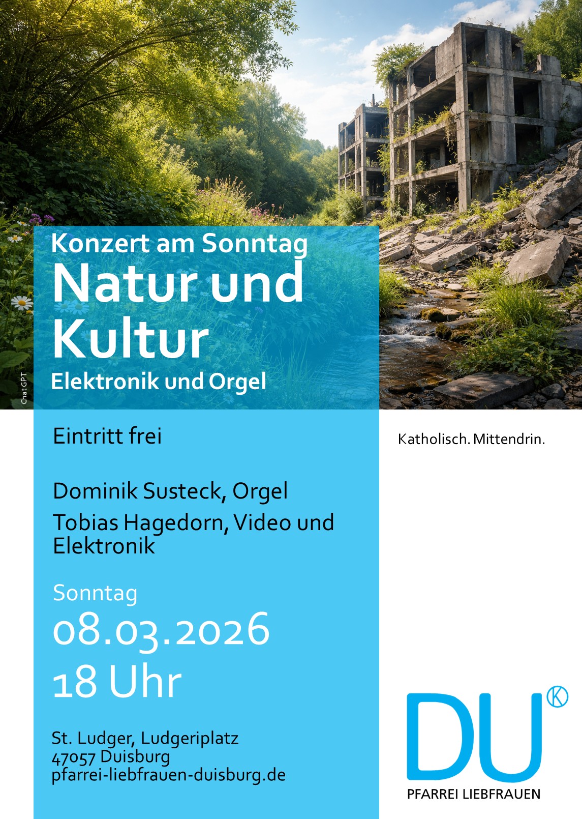 Das Thema "Natur und Kultur" steht auf dem Programm des Konzerts am Sonntag, 08.03.2026 um 18 Uhr in St. Ludger, Neudorf. Der Kuckucksruf zieht sich durch die klassische Musik wie ein Naturmotiv in unterschiedlichen Variationen. So erklingen drei barocke Orgelwerke von Johann Caspar von Kerll, Girolamo Frescobaldi und Georg Muffat, die diesen Ruf enthalten.