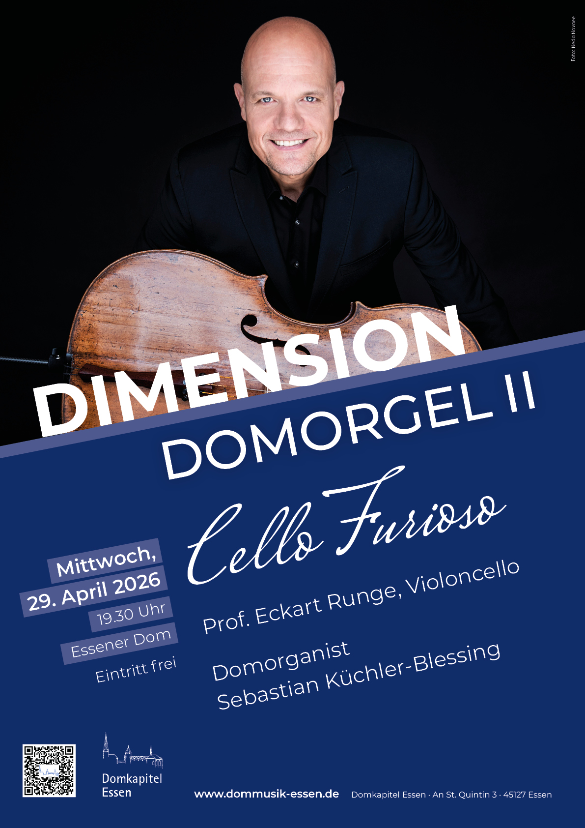 Zu einem frühlingshaften Konzert lädt Domorganist Sebastian Küchler-Blessing am Mittwoch, 29. April, um 19.30 Uhr in den Essener Dom ein. In der Reihe „Dimension Domorgel“ verbindet er bei diesem Konzert unter der Überschrift „Cello furioso“ die Musik der Rieger-Orgel im Dom mit den Klängen des Cello-Professors Eckart Runge, einer der bedeutendsten Kammermusiker der Gegenwart.