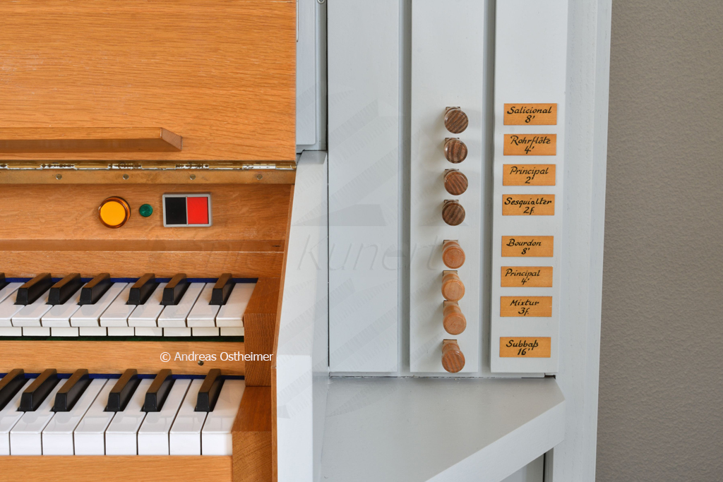 Als klangliche Grundlage stehen Bourdon und Salicional auf die beiden Manuale verteilt. Der Bourdon ist Basis des Plenums aus Prinzipal 4' und Mixtur, das Salicional ist Basis für ein zerlegtes Kornett aus Rohrflöte 4', dem – typisch neobarock auf dem Nebenmanual stehenden – Prinzipal 2' und einer Sesquialter mit Vorabzug der Quinte. Der niedrige Winddruck von 67 mm WS erlaubt einen sehr entspannten Klang. Insgesamt wurde bei der Intonation eine größtmögliche Farbvielfalt und Mischbarkeit erreicht, was durch die Wahl der ungleichstufigen Temperierung nach Vallotti unterstrichen wird.