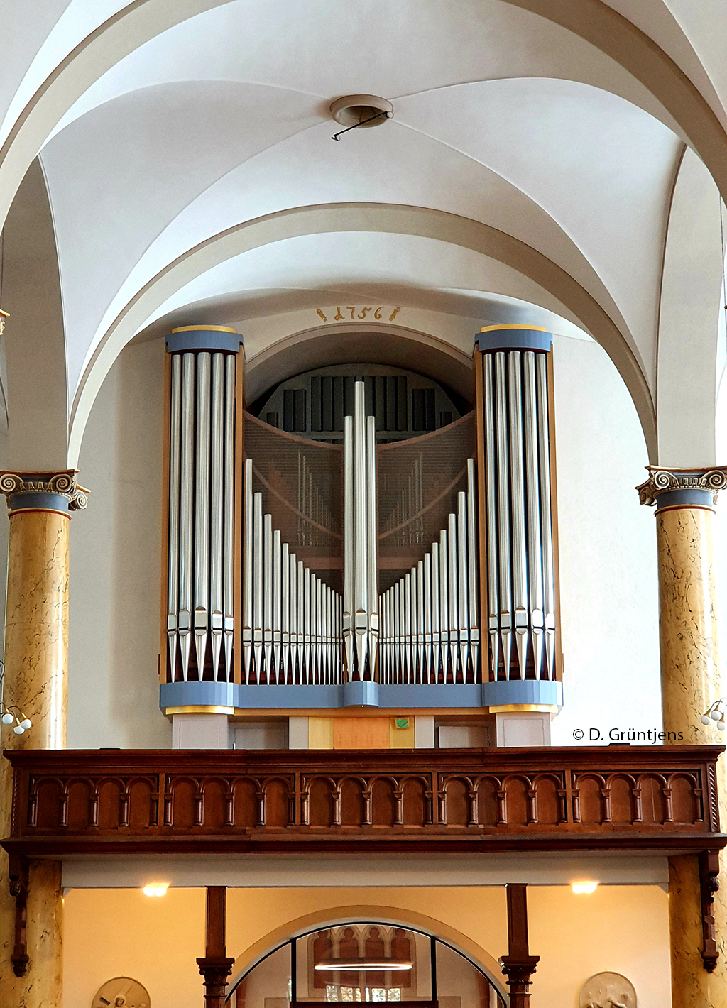 Das neue Instrument fügt sich in seiner äußeren Gestalt harmonisch in die Innenarchitektur des Kirchenraumes ein. Mit der farblichen Gestaltung wurde der Künstler Hubert Spierling beauftragt, der auch die wertvollen Kirchenfenster der Dionysiuskirche entworfen hat.